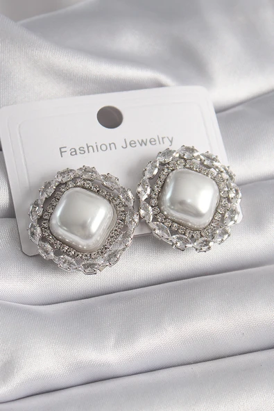 Pirinç Gümüş Renk Kare İnci Zirkon Taşlı Kadın Küpe - TJ-BKP9631