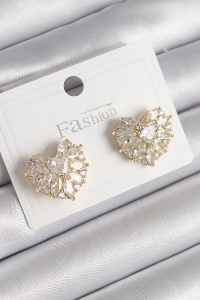 Pirinç Gold Renk Zirkon Taşlı Kalp Model Kadın Küpe - TJ-BKP9750