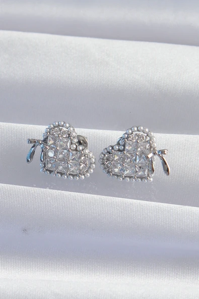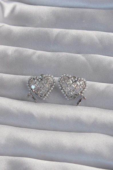 Pirinç Gümüş Renk Fiyonk Detay İncili Zirkon Taşlı Kalp Küpe - TJ-BKP9298