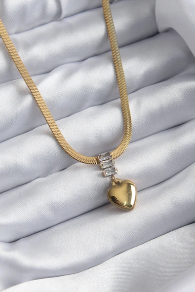 316L Çelik Gold Renk İtalyan Zincir Model Kalp Figür Nazar Boncuk Detay Kadın Kolye - TJ-BKO7925