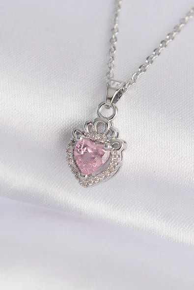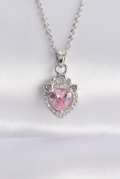 316L Çelik Zincir Gümüş Renk Pembe Zirkon Taşlı Rapunzel Kolye - TJ-BKO8691