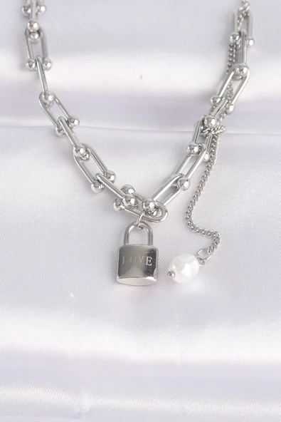 316L Çelik Zincir Gümüş Renk Tiffany Zincirli Love Yazılı Kilit Kolye - TJ-BKO8633