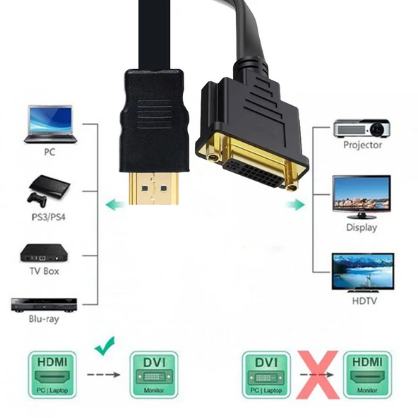 Hdmı erkek to DVI 24+5 dişi slim yassı çevirici kablo 30 cm