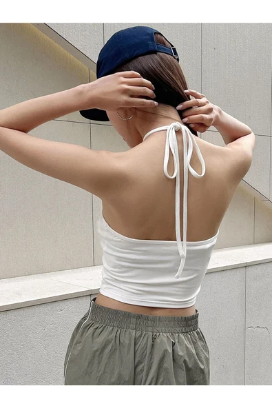 Kadın Halter Yaka Beyaz Renk Bağlamalı Crop Top Bluz