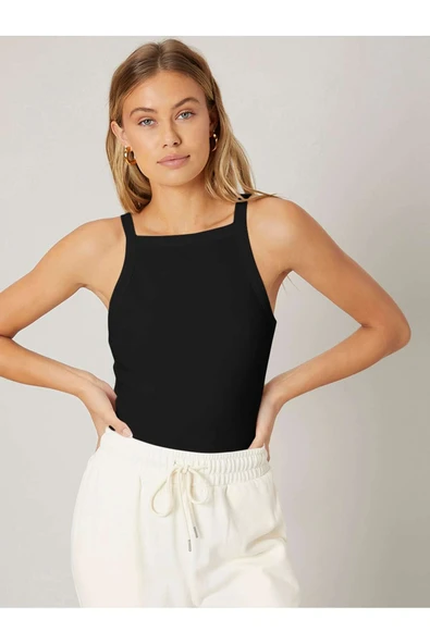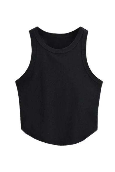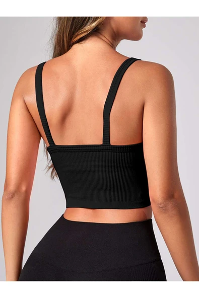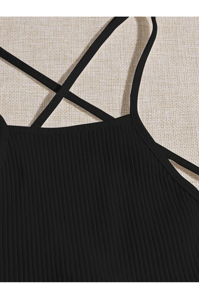 U Yaka Çapraz Askılı Siyah Renk Omuzu Sırtı Açık Kolsuz Likralı Ribana Crop Top Bluz