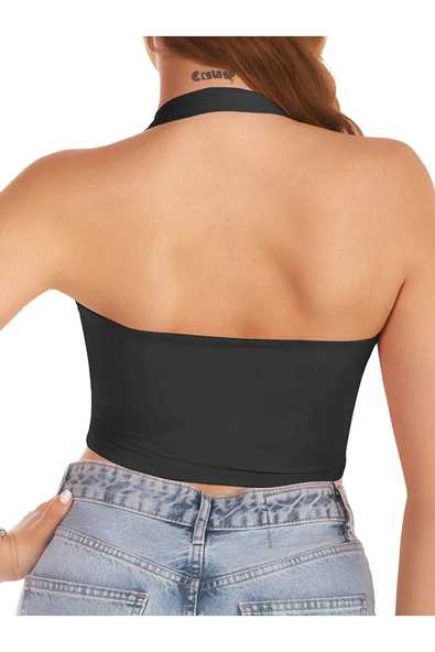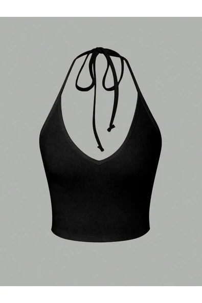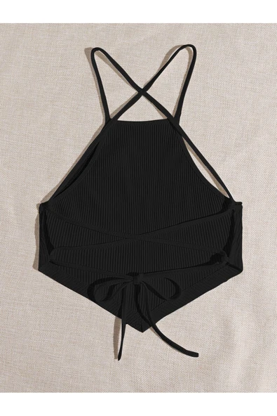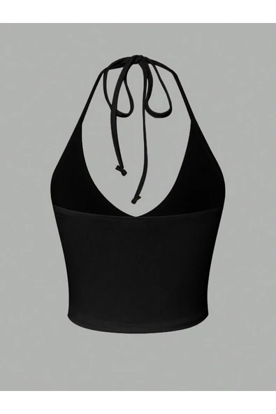 Halter Yaka Sırtı Açık Çapraz Askılı Bağcıklı Siyah Renk Fitilli Crop Top Bluz