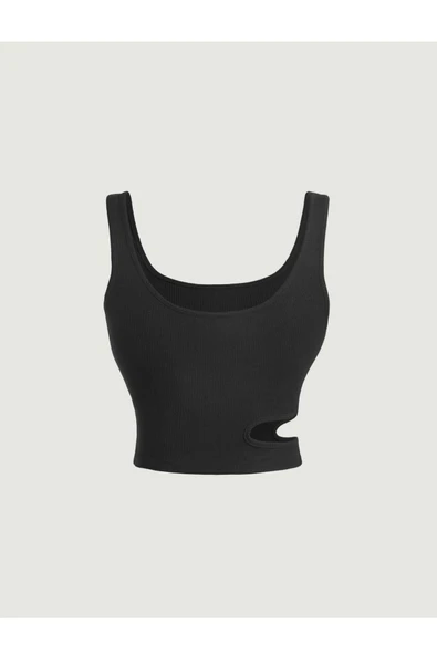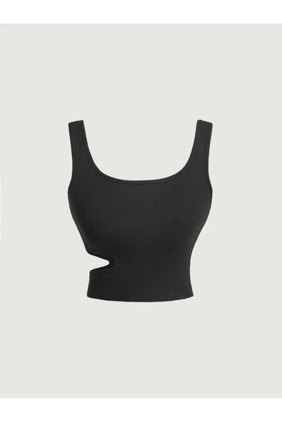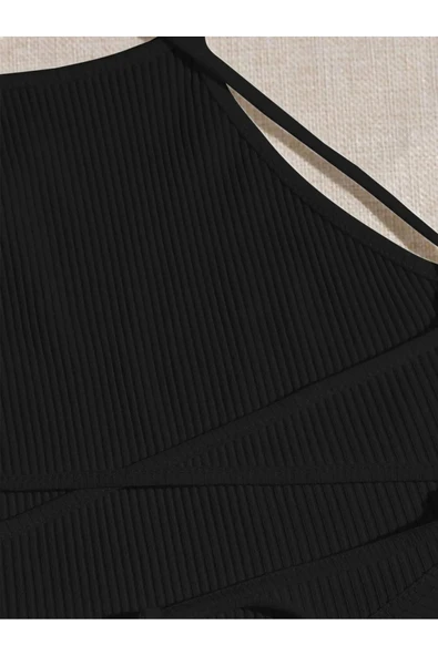 U Yaka Omuz Askılı Asimetrik Kesim Siyah Renk Desensiz Kolsuz Fitilli Likralı Fit Crop Top Bluz