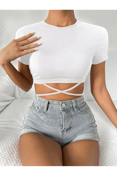 Beyaz Renk Bisiklet Yaka Düz Desensiz Likralı İpli Fitilli Kaşkorse Crop Top Kısa Kollu Bluz