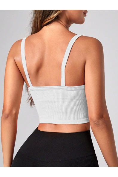Beyaz Renk Kalın Askılı Kare Yaka Düz Desensiz Fitilli Likralı Kaşkorse Crop Top Bluz