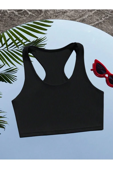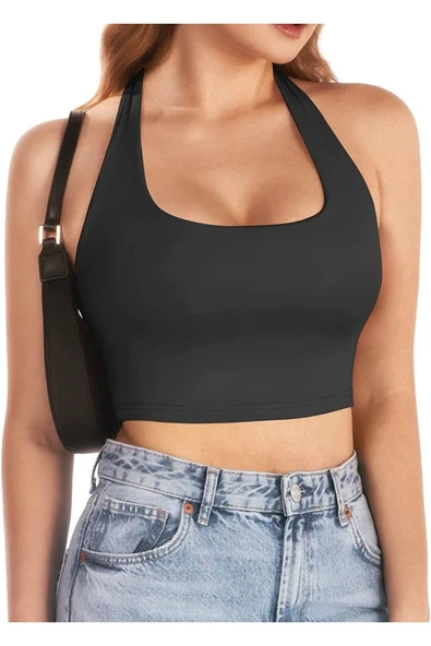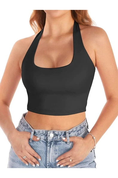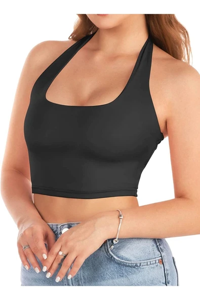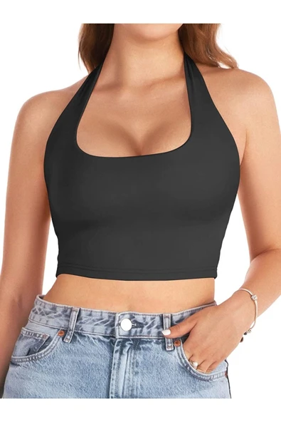 Kadın Boyun Askılı U Yaka Yüzücü Sırtlı Siyah Renk Fitilli Crop Top Bluz