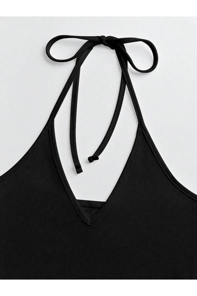 V Yaka Siyah Renk Desensiz Boyun Bağlamalı Fitilli Kısa Kolsuz Likralı Fit Crop Top Bluz