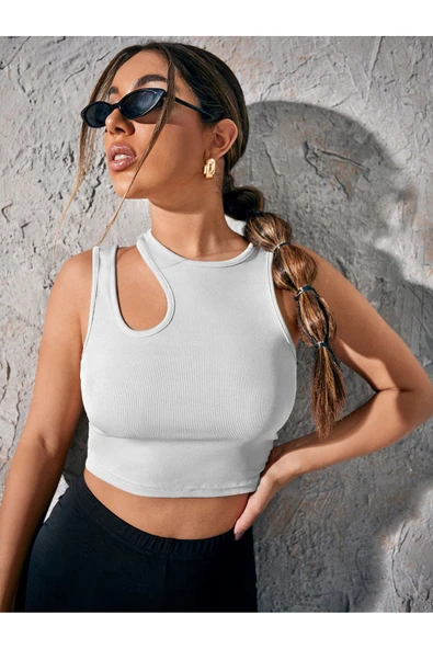 Sıfır Yaka Asimetrik Kesim Beyaz Renk Desensiz Kolsuz Fitilli Likralı Fit Crop Top Bluz