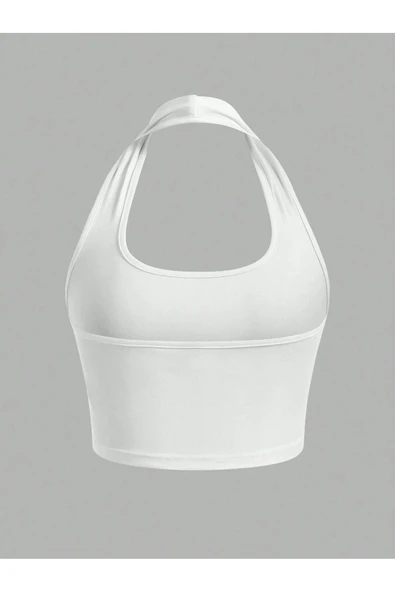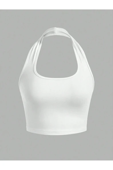 U Yaka Boyundan Askılı Beyaz Renk Omzu Sırtı Açık Kolsuz Likralı Fit Crop Top Bluz