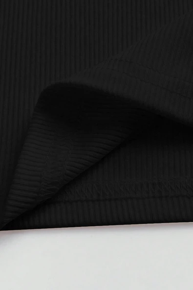U Yaka Siyah Renk Fitilli Kısa Kollu Slim Fit Crop Top Bluz