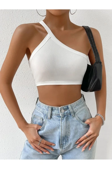 Asimetrik Yaka Beyaz Renk Desensiz Fitilli Kolsuz Tek Omuz Askılı Likralı Fit Crop Büstiyer