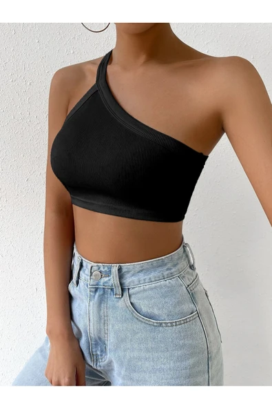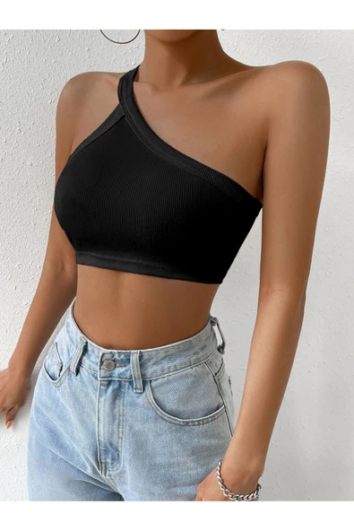 Asimetrik Yaka Siyah Renk Desensiz Fitilli Kolsuz Tek Omuz Askılı Likralı Fit Crop Büstiyer