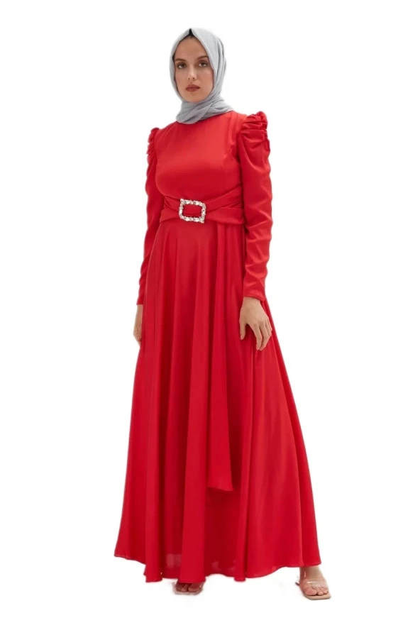 Bel Detaylı Saten Abiye Elbise 711-Kırmızı
