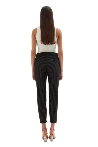 Kemer Detaylı Çizgili Bilek Boy Pantolon 5002-Siyah