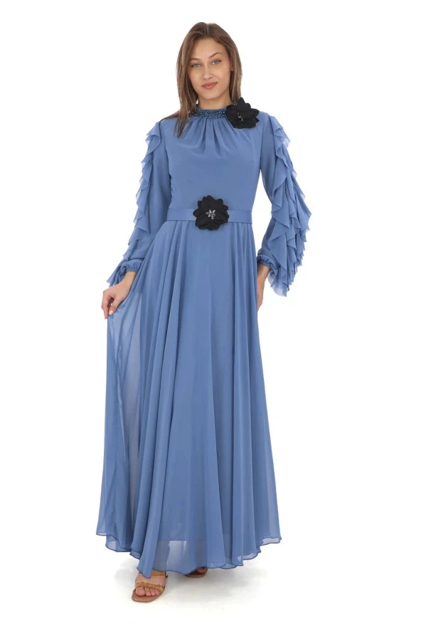 Yaka İşlemeli Kol Fırfırlı Taşlı Çiçek Detaylı Elbise 2708-İndigo
