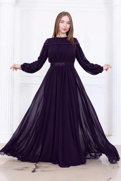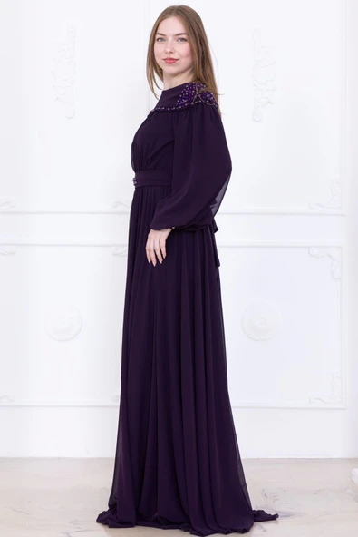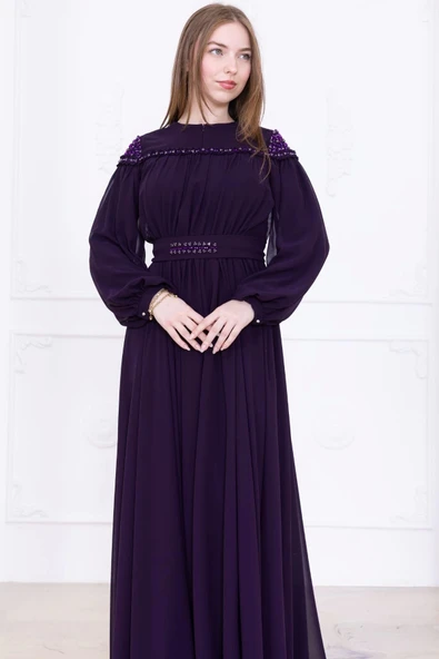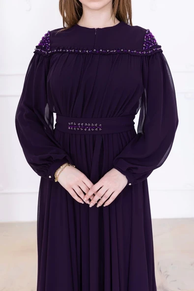 Yaka ve Omuz Boncuk İşlemeli Şifon Abiye 2704-Mor