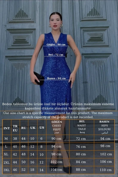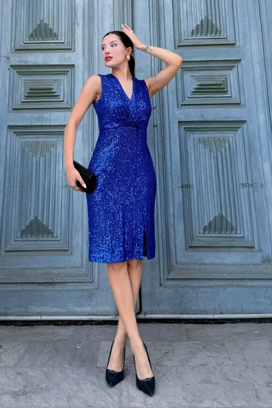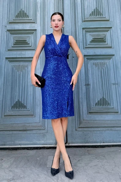 Kruvaze Yaka Payetli Midi Elbise 6031-Gece Mavisi