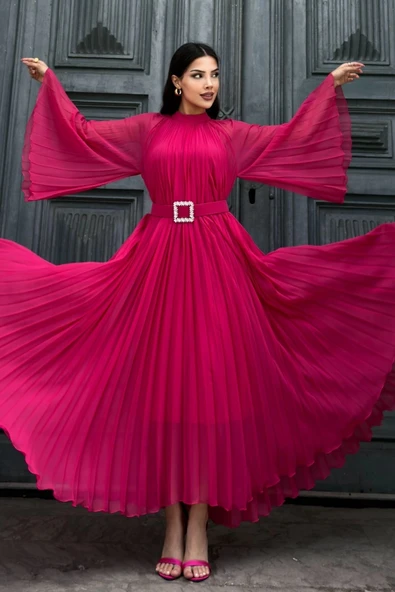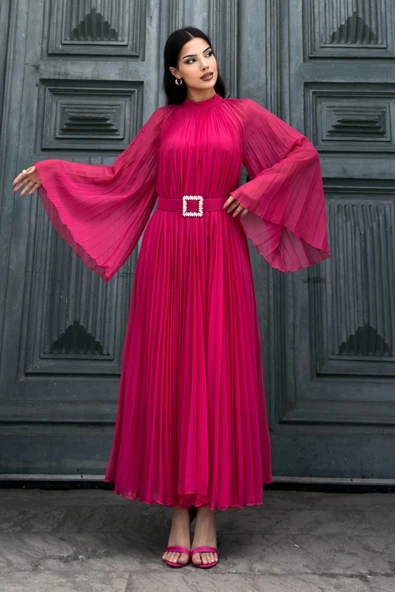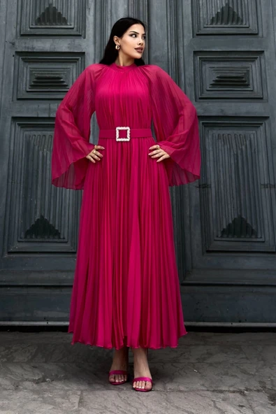 Plise Detaylı Kemerli Rahat Form Abiye Elbise 2183-Fuşya