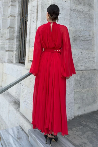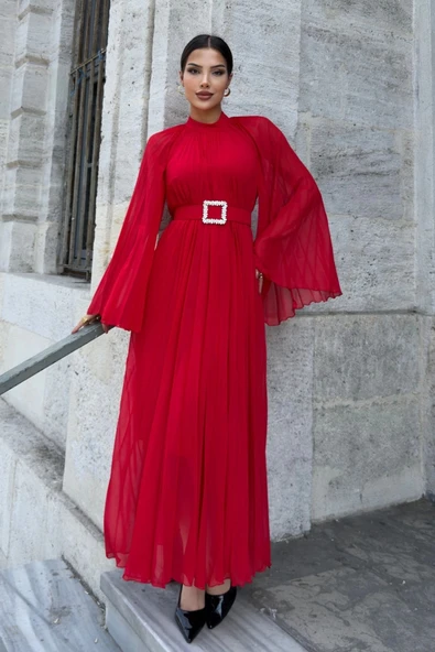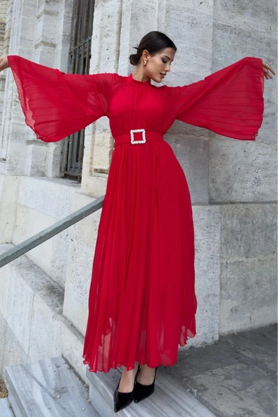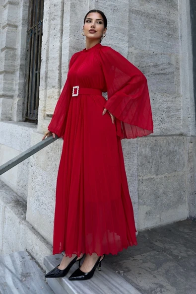 Plise Detaylı Kemerli Rahat Form Abiye Elbise 2183-Kırmızı