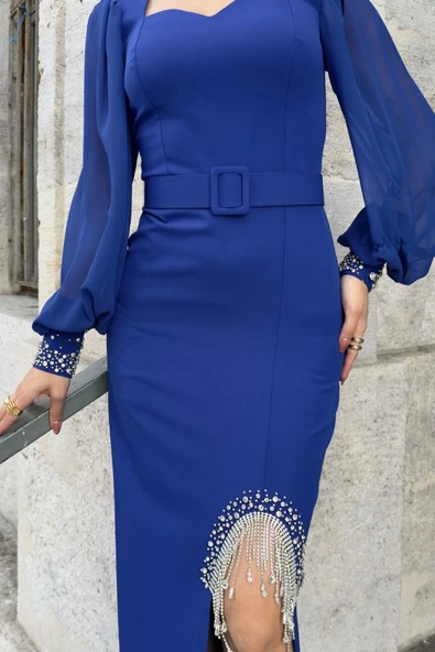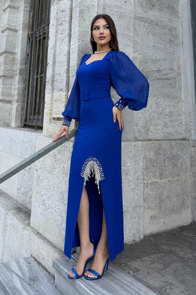 Kalp Yaka İnci ve Zincir Süslemeli Kemerli Abiye Elbise 2238-Saks