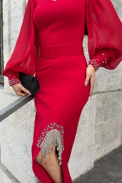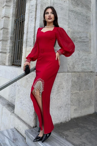 Kalp Yaka İnci ve Zincir Süslemeli Kemerli Abiye Elbise 2238-Kırmızı