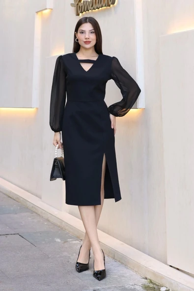 V Yaka Şifon Kollu Yırtmaçlı Midi Elbise 6015-Siyah