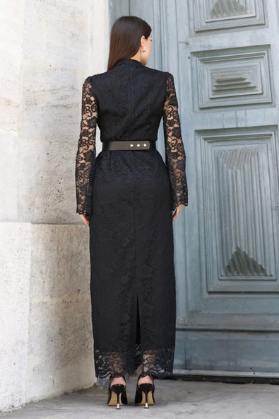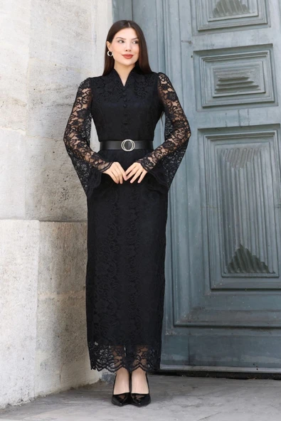 Hakim Yaka Kemerli Dantel Maxi Abiye Elbise 6032-Siyah