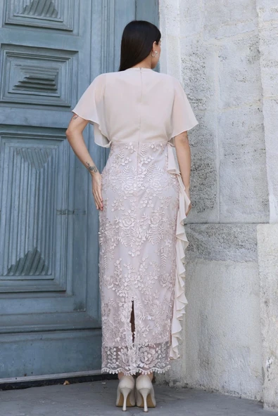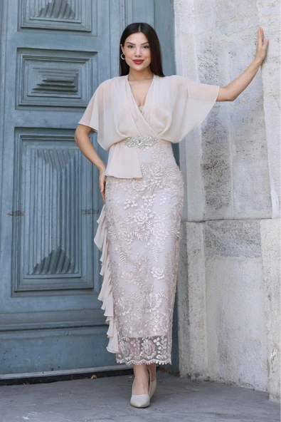 Kruvaze Yaka Şifon Dantel Kombinli Taş ve Fırfırlı Abiye Elbise 6051-Bej