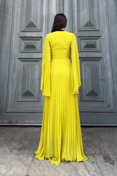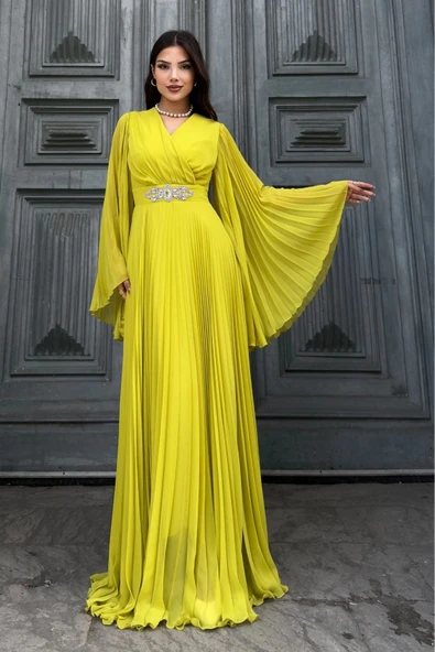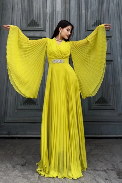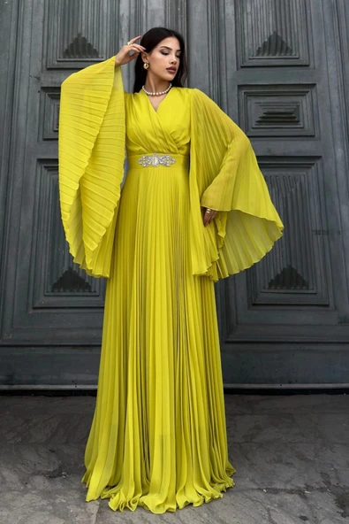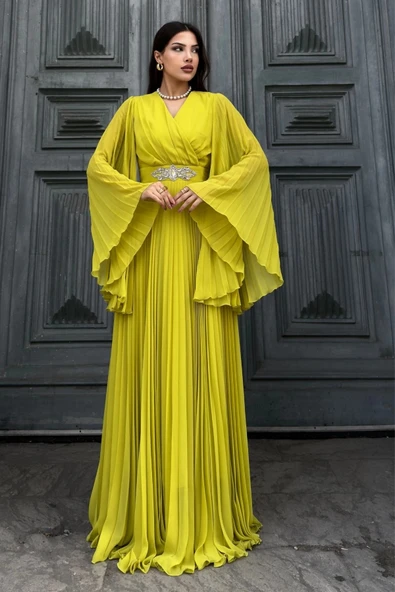 Kruvaze Yaka Yarasa Kol Pliseli Abiye Elbise 2235-Olive