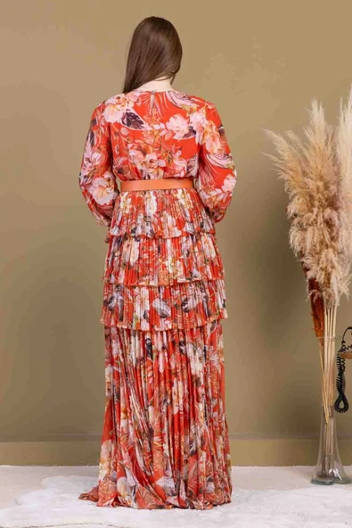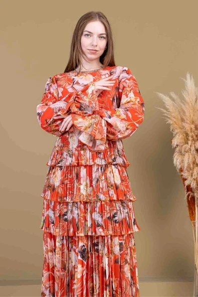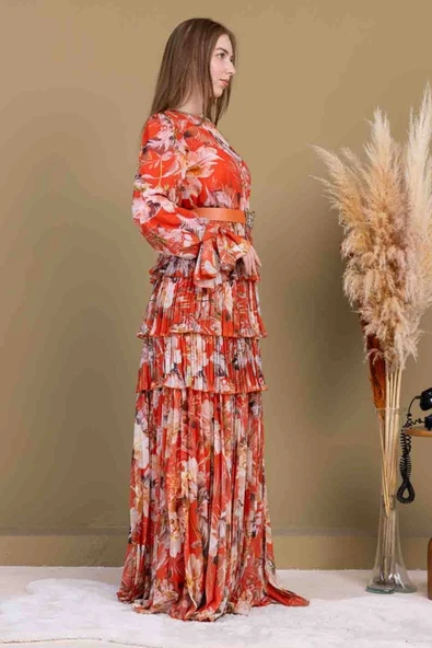 Kat Kat Pliseli Şifon Elbise 2718-Oranj