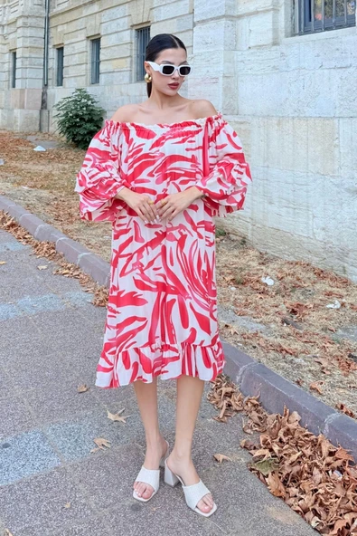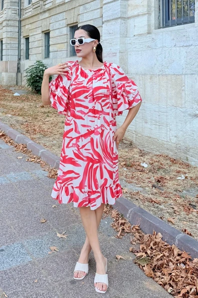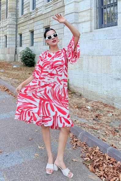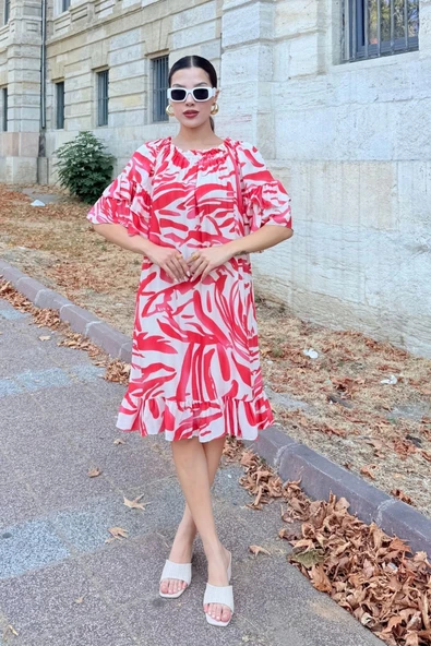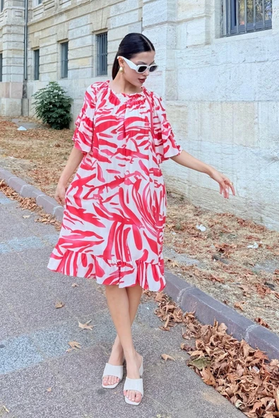 Yaka Lastikli Fırfır Detaylı Rahat Form Viskon Elbise 6024-Fuşya