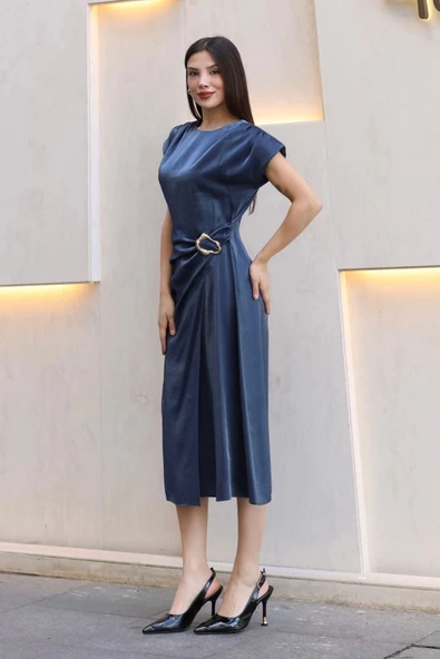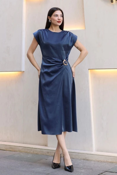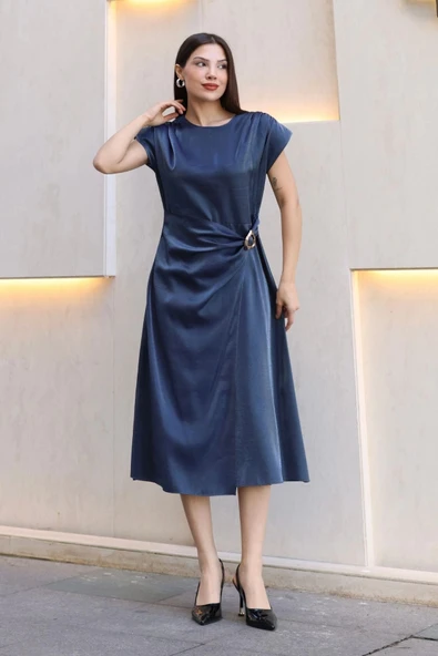 Toka ve Drape Detaylı Soft Saten Midi Elbise 6042-Lacivert