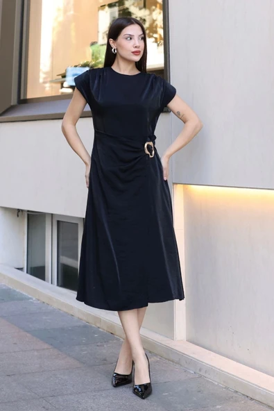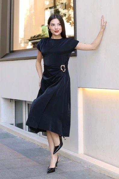 Toka ve Drape Detaylı Soft Saten Midi Elbise 6042-Siyah