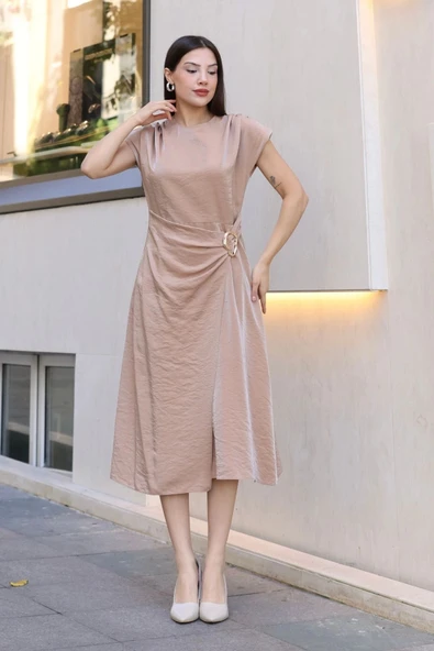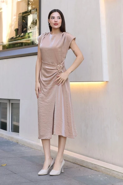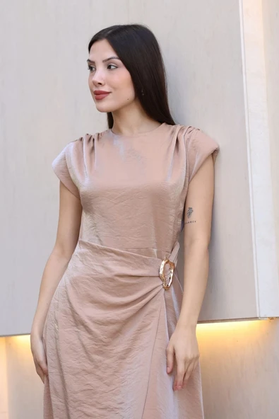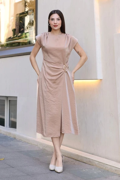 Toka ve Drape Detaylı Soft Saten Midi Elbise 6042-Bej