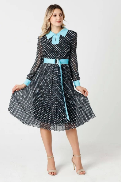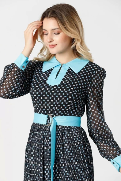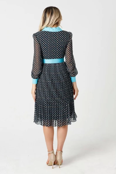 Bağlama Detaylı Pliseli Elbise 1774-Siyah/Turkuaz