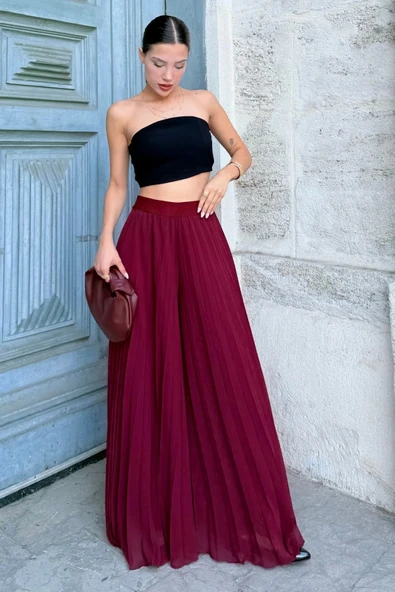 Beli Lastikli Pliseli Şifon Pantolon 6030-Bordo
