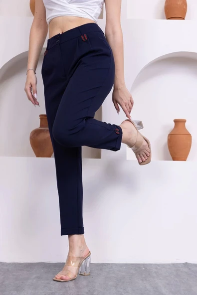 Düğme Detaylı Beli Lastikli Bilek Boy Pantolon 351-Lacivert