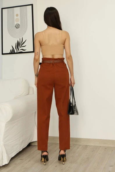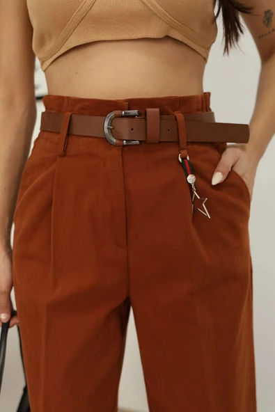 Aksesuar Detaylı Pileli Gabardin Kumaş Pantolon 5807-Kiremit
