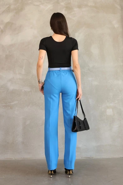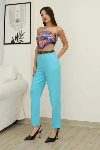 Kemer Detaylı Beli Lastikli Keten Pantolon 6167-Turkuaz