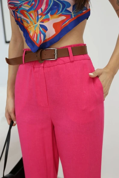 Kemer Detaylı Beli Lastikli Keten Pantolon 6167-Fuşya