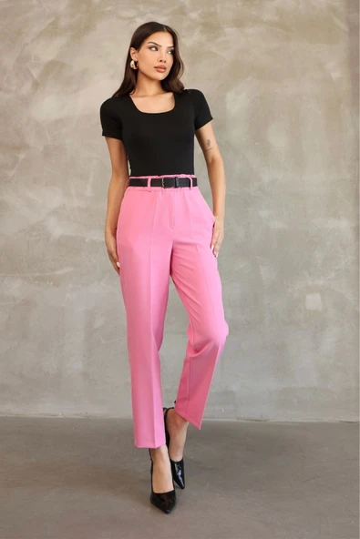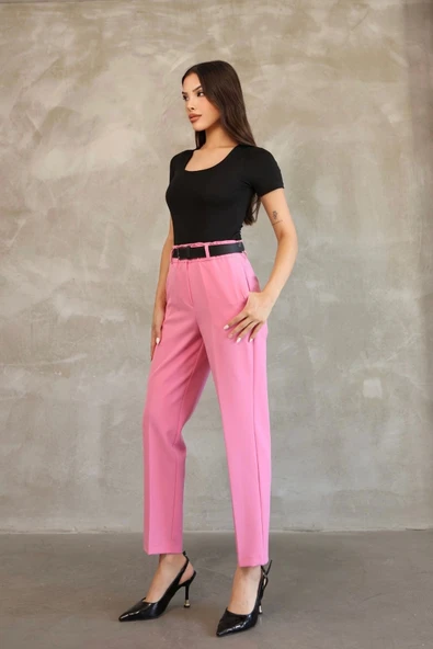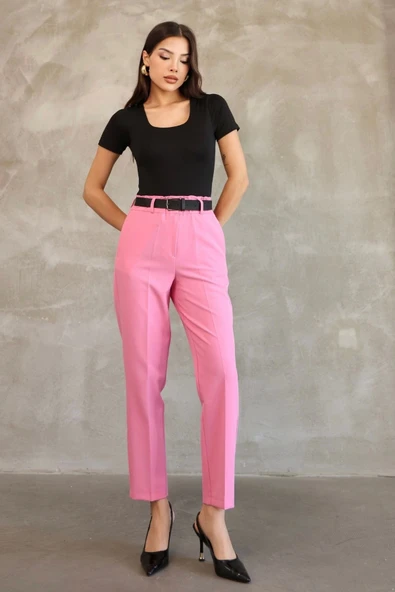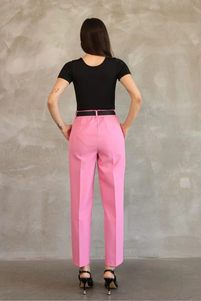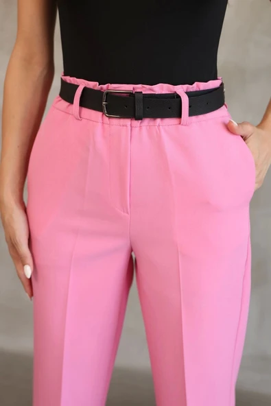 Kemer Detaylı Beli Lastikli Kumaş Pantolon 6163-Pembe