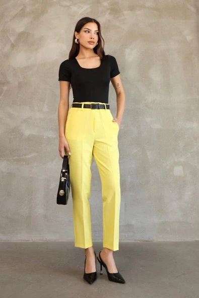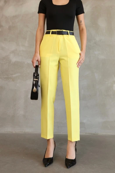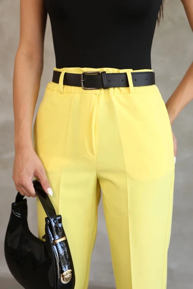 Kemer Detaylı Beli Lastikli Kumaş Pantolon 6163-Sarı