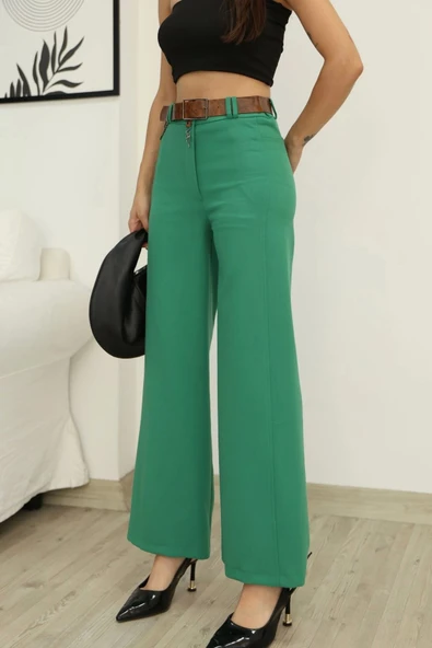 Aksesuar Ve Kemer Detaylı Palazzo Kumaş Pantolon 6115-Yeşil