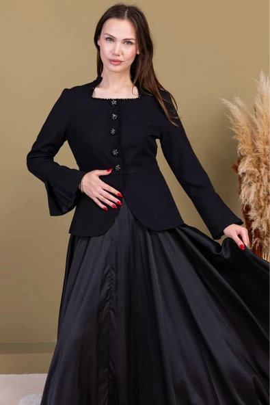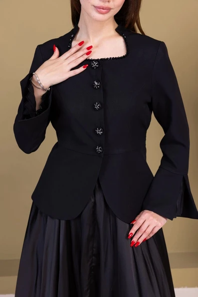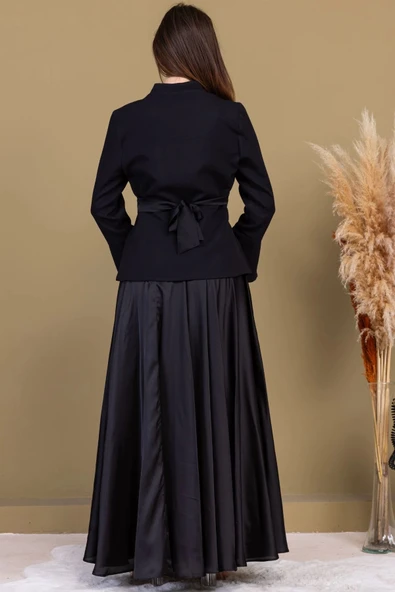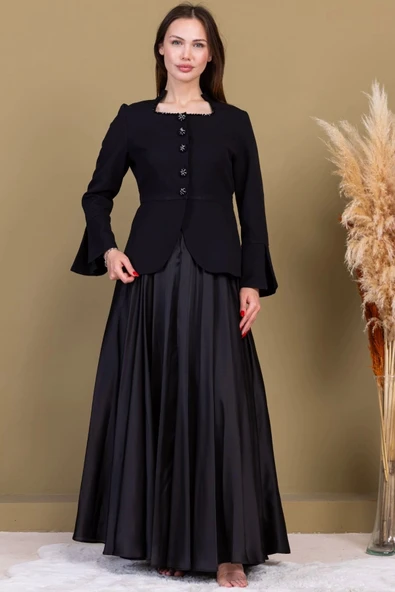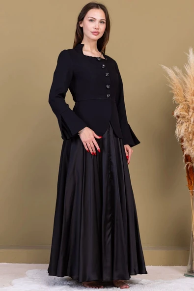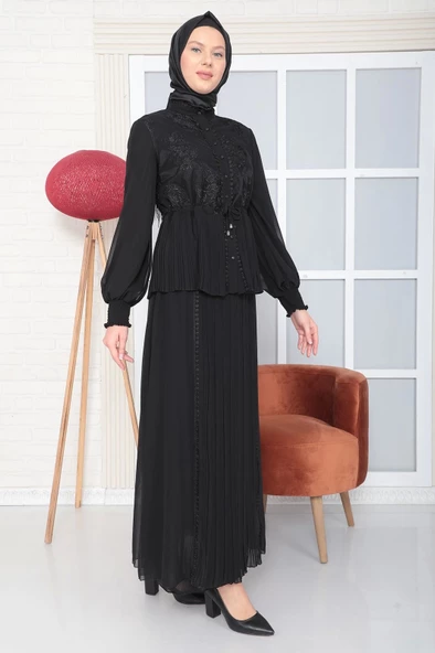 Boncuk İşleme Detaylı Asimetrik Abiye Takım 2388-Siyah