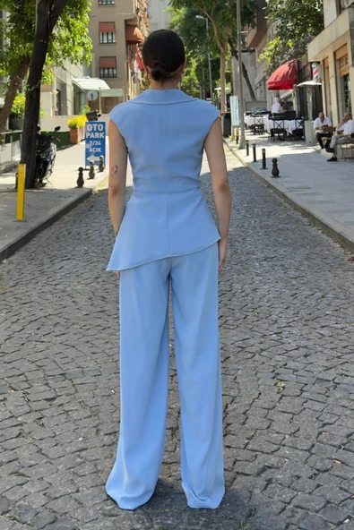 Boncuk İşleme Detaylı Asimetrik Abiye Takım 2388-Mavi