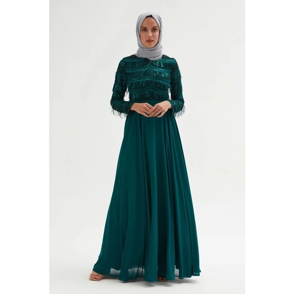 İşleme Detaylı Tesettür Abiye Elbise 634-Zümrüt Yeşili